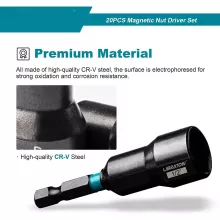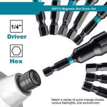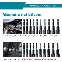 This set features 20 magnetic nut drivers, including 10 metric sizes (5mm to 13mm) and 10 SAE sizes (3/16 in. to 1/2 in.). Each piece is crafted from tough chrome-vanadium steel for outstanding durability and shock resistance. A high-strength magnetic core ensures a secure grip on screws and bolts, preventing slips and saving you time on every job.
