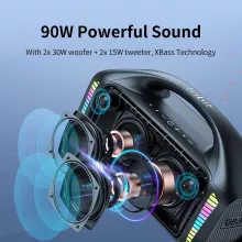 Introducing the ultimate portable Bluetooth speaker that brings the concert to your backyard, beach, or camping trip. With its 90W stereo sound and innovative XBass technology, this speaker delivers distortion-free, rich, and balanced audio that will make your heart beat to the rhythm of your favorite tunes. Designed for music enthusiasts and adventure seekers alike, this speaker is your ticket to an unparalleled audio experience.