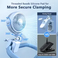 This fan is more than just convenient—it’s built to perform. With four adjustable wind speeds and a powerful 2000mAh battery, you can enjoy hours of cooling relief without being tied to a power outlet. Its quiet operation ensures your baby stays undisturbed, while the 360° rotatable design lets you direct the airflow exactly where it’s needed most. Use it handheld for a quick cool-down, or clamp it securely to a surface and let it run hands-free.