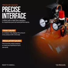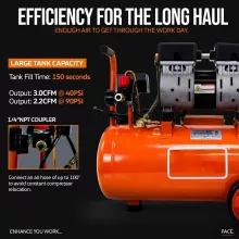 Introducing our latest innovation in air compressors – a masterful blend of speed, power, and quiet operation. Experience a new level of efficiency with our 6.3-gallon tank that fills in a mere 150 seconds, ensuring you’re always ready for action without the long wait. Perfect for both professionals and DIY enthusiasts alike, this compressor is designed to meet a wide range of needs.