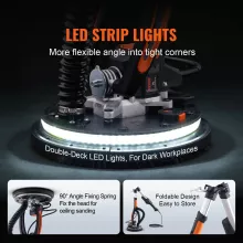 Its lightweight 7 lb body and balanced 3:7 weight distribution reduce arm fatigue, letting you work longer with better control. The extendable, foldable pole makes sanding high walls or tight spaces simple, while dual LED strips keep your workspace clearly visible.