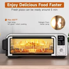 With an impressive 1700W of power and a blazing maximum temperature of 660°F, this oven ensures every dish cooks evenly and thoroughly. Enjoy golden fries, juicy chicken, or perfectly melted pizza — all in a fraction of the time of traditional ovens. Its digital control panel and preset functions make operation effortless, letting you focus on what really matters: delicious results.
