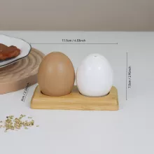 Each set includes two adorable egg-shaped shakers resting on a natural bamboo base, creating a cozy and organized look. The handmade ceramic finish ensures durability and timeless elegance, while the snug bamboo base keeps everything neatly in place. Measuring conveniently compact, this set fits beautifully on any table or spice rack without taking up too much space—about the size of a small teacup (approximately 3–4 inches tall).