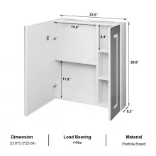 Inside, the cabinet features two generous compartments to neatly store your essentials—everything from skincare and cosmetics to toothbrushes and medicine. Crafted from moisture-proof and waterproof E1-grade particleboard and a copper-free silver mirror, it’s built to last in humid bathroom environments. Measuring 23.7″W x 25.6″H x 5.3″D, it’s ideal for most bathroom spaces and installs easily with surface wall mounting.