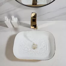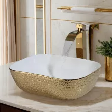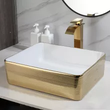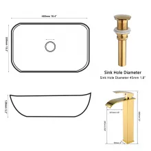 This elegant bathroom kit includes everything you need for a complete setup: the ceramic basin, a gold-finished brass faucet, and a pop-up drain system. Designed for easy installation on any countertop, the sink combines functionality with timeless charm. Its rectangular form offers ample space for comfortable daily use, making it ideal for both residential and commercial bathrooms.