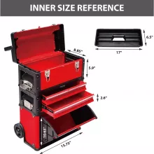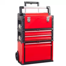 Our trolley tool box is ingeniously designed with three separate, stackable parts, each tailored for specific storage needs. The top section, a handy tool box, features an aluminum handle and a large, removable tray, offering quick access to your most-used tools. The robust metal latch closure ensures your tools stay secure.
