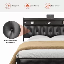 This Queen Bed Frame is perfect for anyone looking to maximize their bedroom’s space without sacrificing style or comfort. The built-in storage headboard allows you to keep your essentials like phones, tablets, and glasses close at hand while keeping your bedroom organized. The LED lights not only add a touch of modern sophistication but also help you relax with adjustable brightness and color settings. Whether you’re a tech enthusiast who needs quick charging or someone who loves a cozy and quiet sleep environment, this bed frame caters to all your needs.