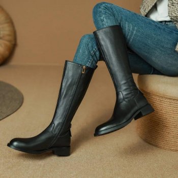 Women’s Genuine Leather Knee High Boots – Thick Heel Motorcycle Style