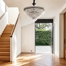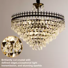 Crafted with a balanced mix of 60% premium crystals and 40% durable iron, this chandelier showcases a polished black finish that complements both vintage and contemporary interiors. The round layered crystal design reflects light beautifully, creating a dazzling ambience. Adjustable hanging height (35.43 in to 59.05 in) allows perfect placement over kitchen islands, dining tables, or high-ceiling entryways.