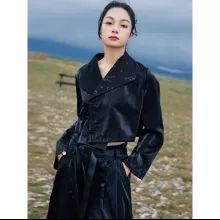 What sets this jacket apart is its unique blend of cultural heritage and contemporary fashion. The dark, new Chinese style, paired with a slim, flattering fit, makes it not just a piece of clothing but a statement of personal style. Its high-waist design enhances the body’s natural lines, creating a silhouette that’s both elegant and modern.